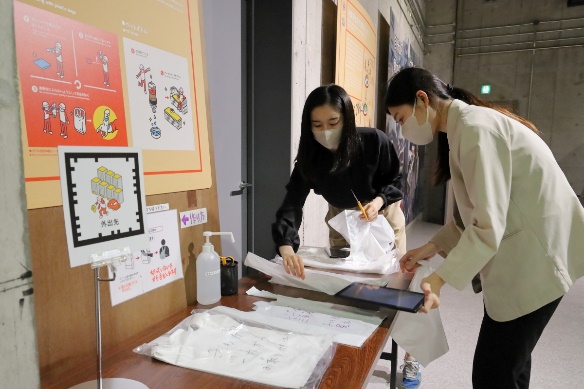 避難所ゾーンでは、ARと連動した実物展示で避難所の過ごし方が体験できます。簡易トイレの使い方やレジ袋を三角巾の代わりにする方法、災害時伝言ダイヤルの仕組みなど、その状況になってからではとまどってしまうような事柄も学ぶことができます。また、地震の揺れを擬似体験するコーナーもあります。