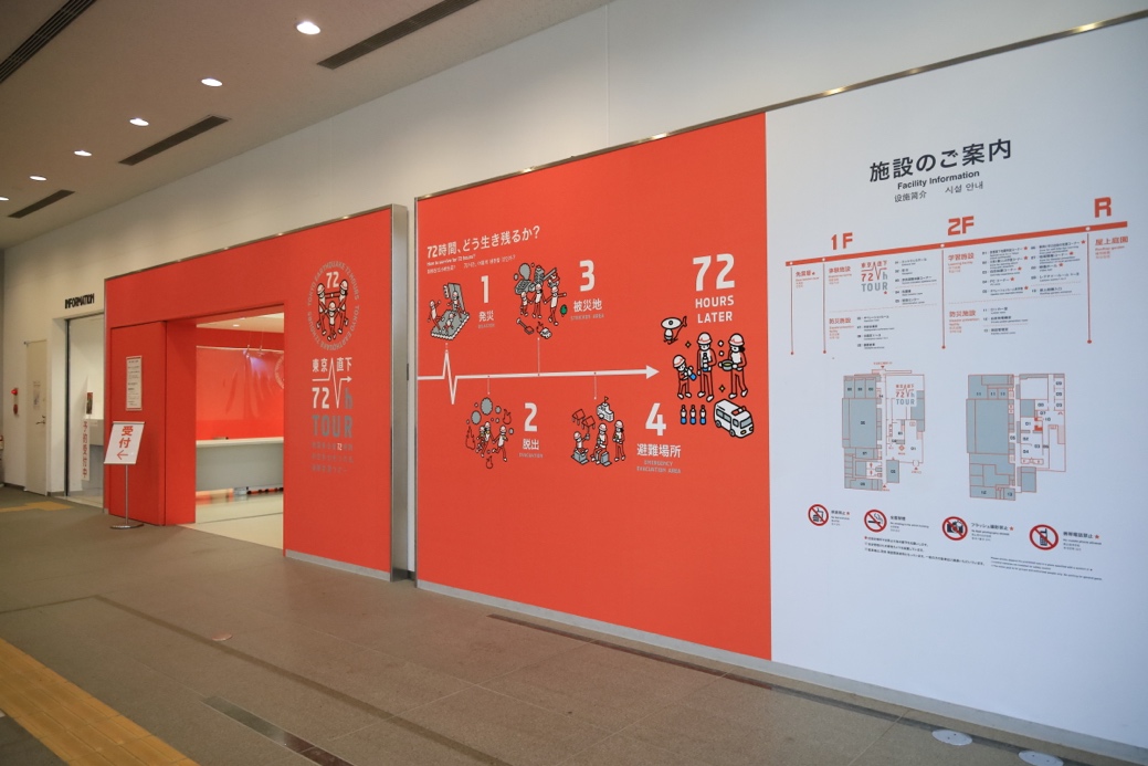 “72時間”=3日間は、人命救助の観点から人間が飲まず食わずで生きていられる生存率の分岐点ともいわれ、国や自治体などの「公助」活動においては、この時間を目安とした初動が最優先課題となります。大規模災害が発生した際、こうした公共機関が被災現場の状況を把握し、適切な支援を決定・実行するまでの間、被災者は「自助・共助」の活動で生き抜かなければいけません。この期間にどういった困難が発生するか、それに対してどう対処すればよいのかをあらかじめ学習できる施設が「そなエリア東京」であり、「東京直下72h TOUR」は、首都直下型地震に遭遇しても1人ひとりが適切な行動を取れるようにと提供されている体験学習ツアープログラムです。