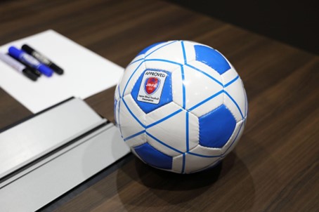 [JBFA公式ボール。フットサルボールと同じサイズで転がると「シャカシャカ」音が鳴る構造] -