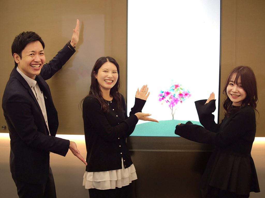 笑顔が多い会議だと、サイネージ画面に木が生えて花が次々に咲いていきます
