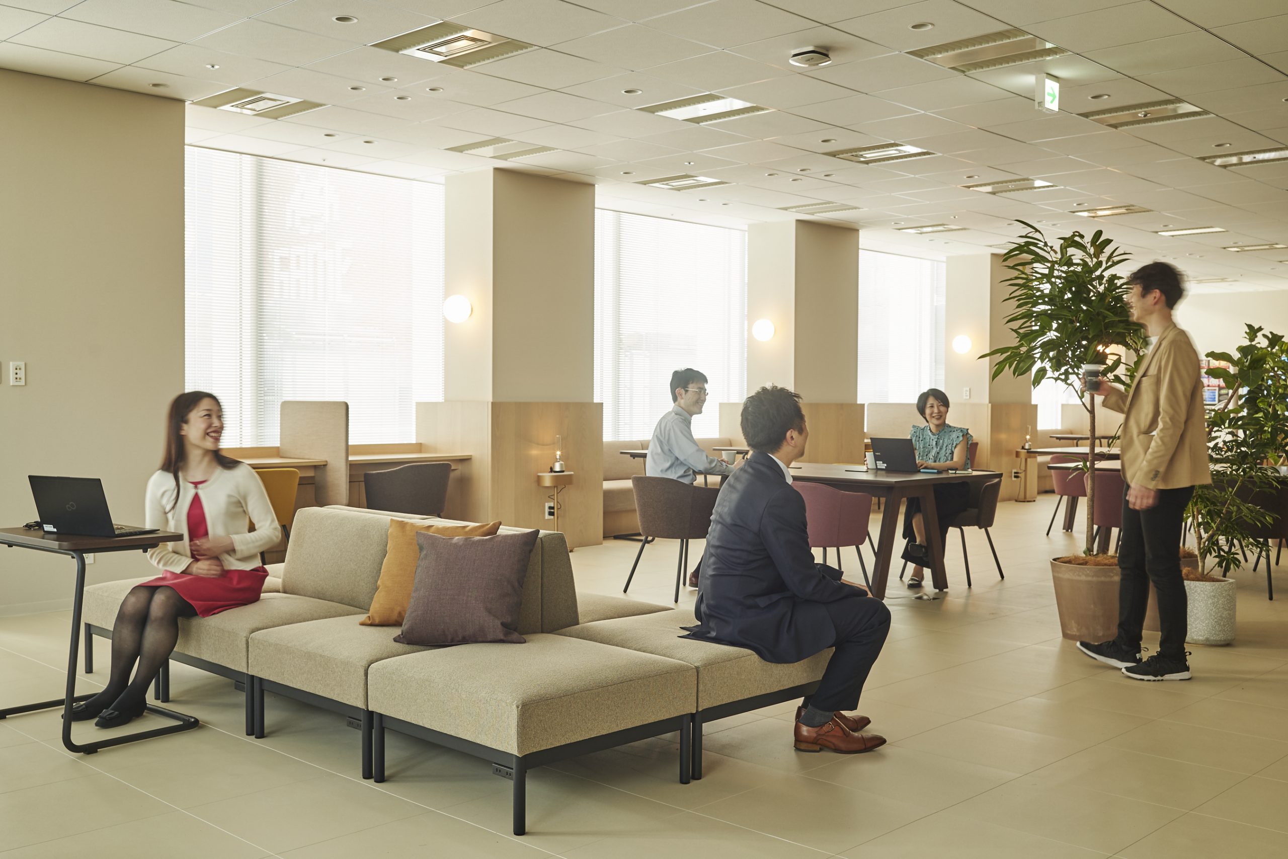 お客さま・従業員を迎えるエントランス空間「INTRODUCTION(イントロダクション)」と仕事に集中できる「FOCUS(フォーカス)」を紹介した前編に続き、後編となる今回はまず、カフェテーブルやソファベンチで仕事ができる「CASUAL(カジュアル)」エリアに向かってみます。