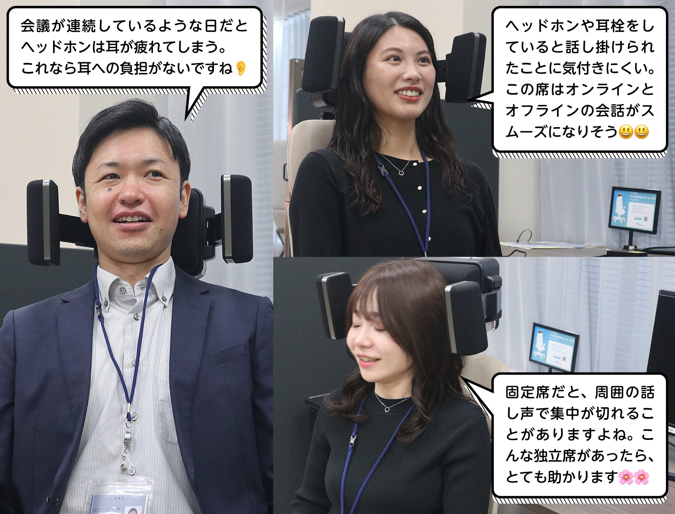 このスピーカーに音楽を流してもらったところ、離れていると何も聞こえてきませんが、着席したポジションだと確かに自分だけに音が聞こえてくるので不思議です。耳を完全に塞ぐことなく周囲の声が感じられるようになっているため、エリア内の人の呼び掛けにも応じることができます。リモートとオフィスの隔てなく、近くにいる人の雰囲気を感じながら仕事が進められる仕組みは、ツアー参加者全員に好評でした。