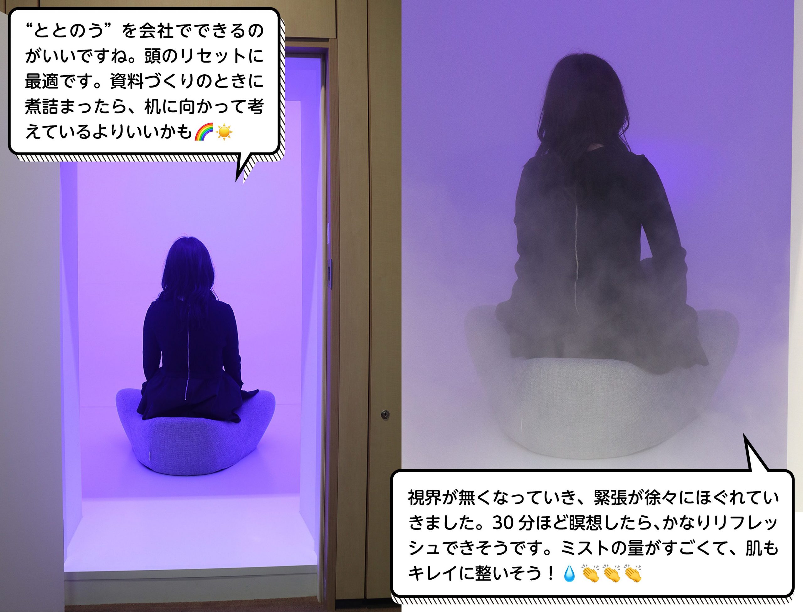 集中力を高めたい、やる気を整えたいといった従業員の要望には瞑想室がおすすめです。室内に入ると音楽が流れ、座り方についてアナウンスされます。外部からの音はほとんど聞こえなくなりました。しばらくすると、ミストが出てきて、プログラムの最後には香りに満たされます。この瞑想室には、多くのリピーターがいるそうで人気の高さが伺えます。「大事な会議の前に使っている」との声もあるようです。
