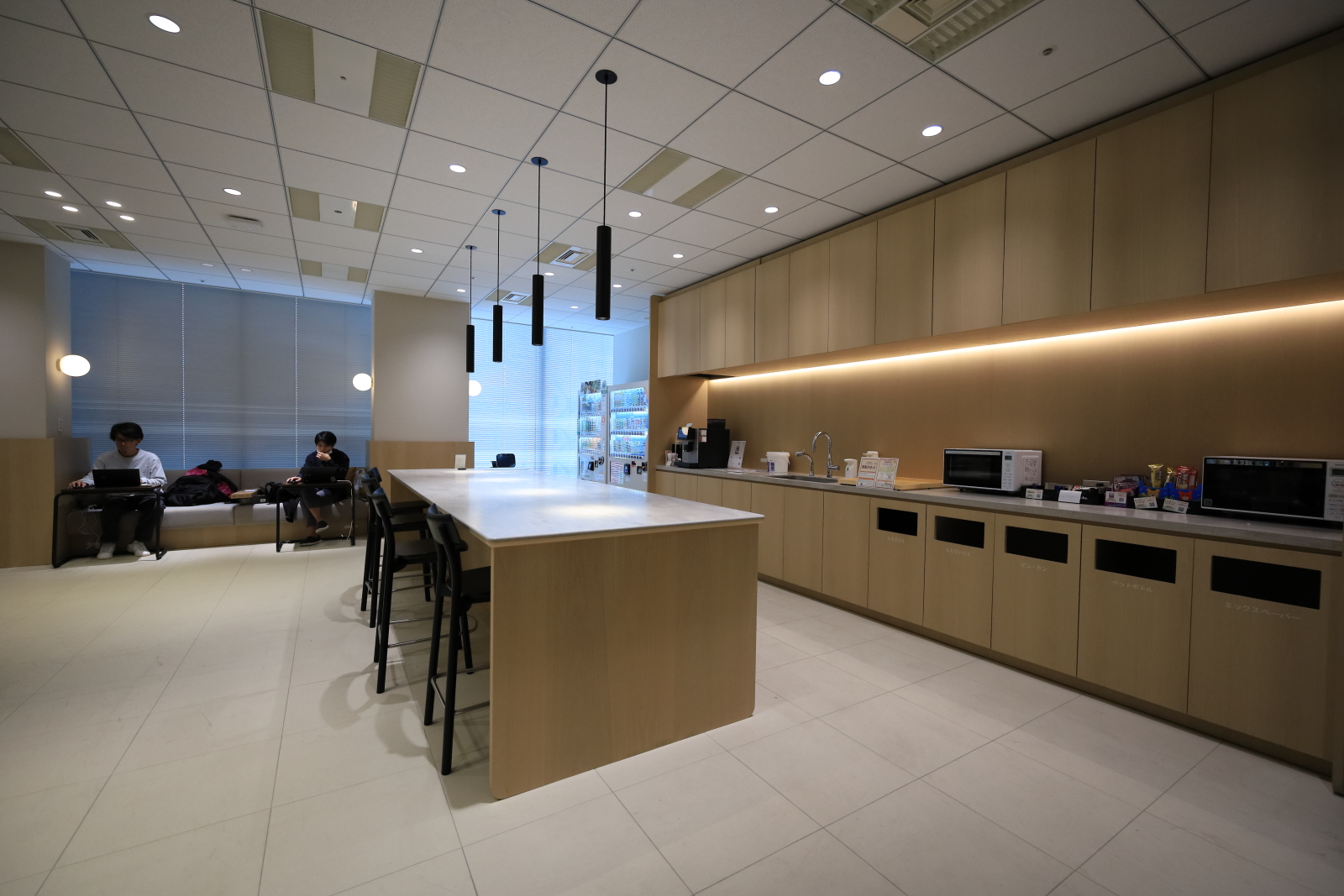 「CASUAL」は、お洒落なBGMが流れていて、自然と会話したくなる雰囲気のエリアです。いわゆる給湯室という閉じた場所はなく、ちょっとした休憩ができるカフェスペースと連続して、仕切りのないオープンな空間が広がっています。ここなら、仕事の合間の気分転換がしやすそう。