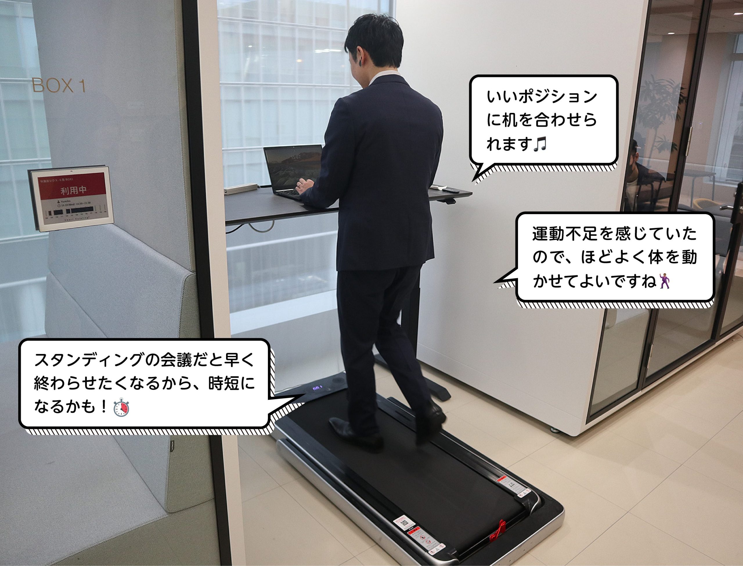 昨年の大阪・関西万博では日本から海外へ「SWGs宣言」が発信されました。今年から、より従業員のウェルビーイング向上に努めたいという会社が増えていくことでしょう。従業員の働きやすい環境づくりのため、自社のオフィスに適した座席バリエーションを探されている方には、この「CASUAL」エリアがよい刺激になるのではないでしょうか。このエリアには、ほかにもWeb会議や面談などに使える個室ブースや、ウォーキングマシンで歩きながら仕事のできる変わり種のスペースがあります。みなさんも見学される機会がありましたら、いろいろと体験してみることをおすすめします。