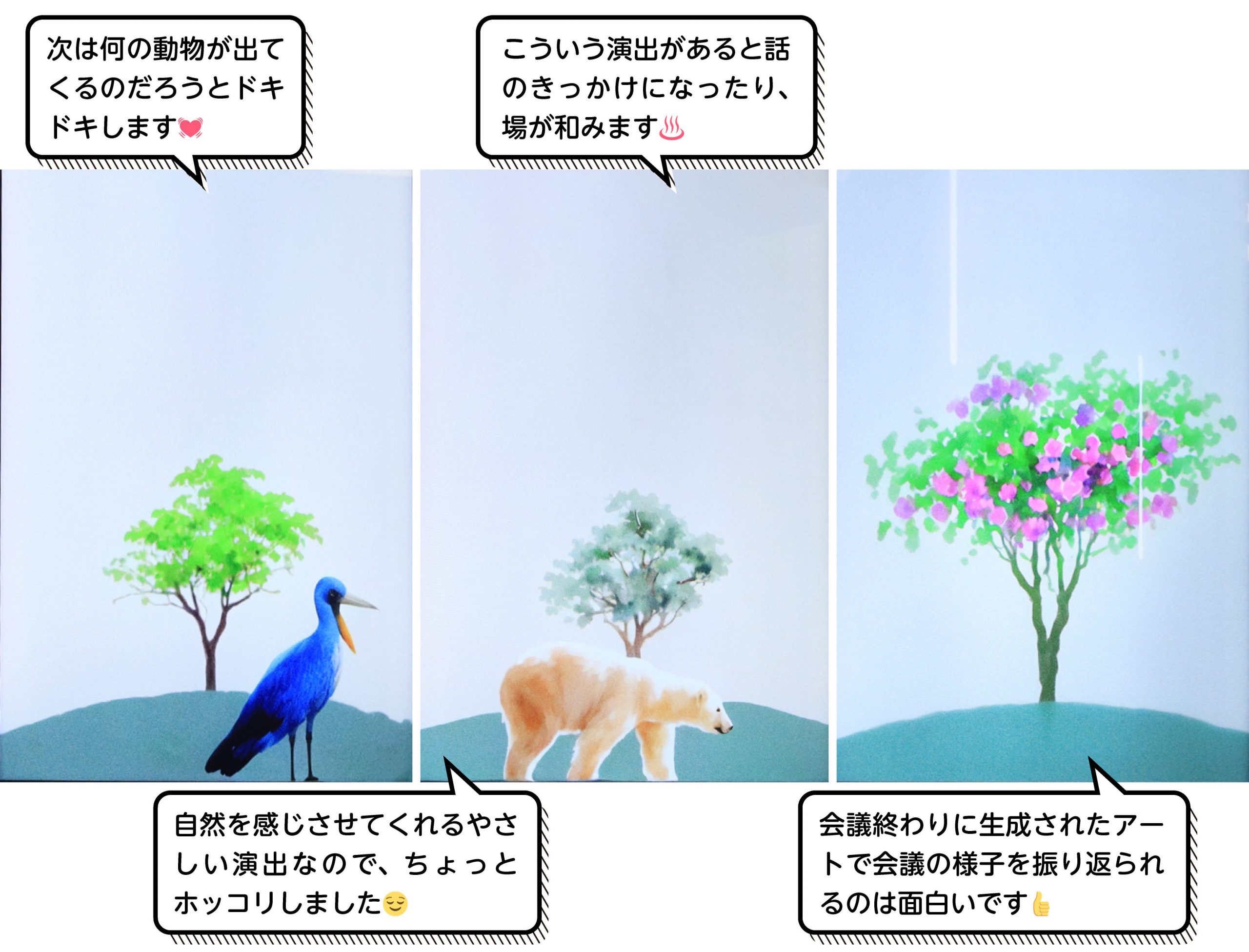 表情によっては雨模様になったり、時には鳥や動物が出てきて笑顔を誘ったり。まさに、“会議に花を咲かせる”新しい会議が体験できます。