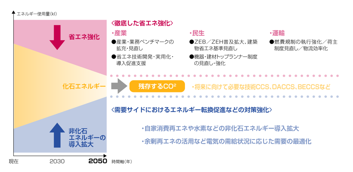 法改正にあたって主眼に置かれたのは、2050年カーボンニュートラル目標や、2030年の温室効果ガス削減目標46%減(2013年度比)といった政府目標です。これらを踏まえて国内のあらゆる事業者は、経営の努力目標としてエネルギーを使用する際の合理化、効率化に努めることが期待されています。エネルギーの需要側におけるカーボンニュートラルに向けた取り組みの方向性は、以下の図がわかりやすいでしょう。