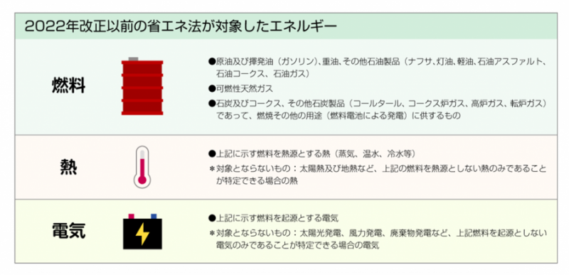 オイルショックをきっかけに1979年(昭和54)に制定された「エネルギーの使用の合理化等に関する法律」のことを「省エネ法」といいます。その目的を端的にいえば、エネルギー使用者にその効率的な利用や消費量の削減といった合理化を求め、国民経済の健全な発展を促すことにあるといえます。省エネ法が対象とするエネルギーは、下表で示す通り、この法律の根拠から化石由来のエネルギー(燃料、熱、電気の3つ)を対象としていて、2022年の法改正まで、非化石エネルギーは対象外でした。