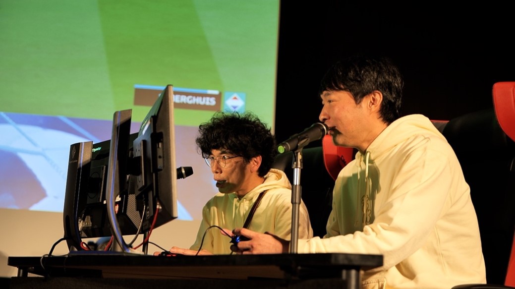 [プレイを実況する片桐仁さん(左)、エレキコミック今立さん(右)] ※会場写真(提供:株式会社ザイグー) -