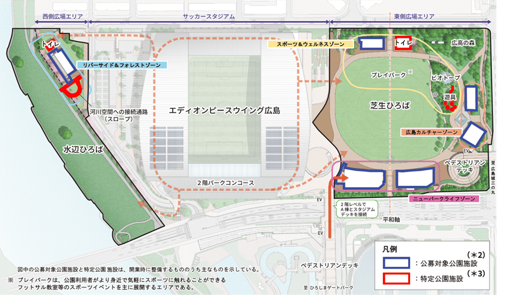 本事業においては、広島市民のみならず県内外・海外からの来訪者含め、『多様な「活動(ACTIVE)」を創り出すことで、新たな「交流(COMMUNITY)」を形成し、日常的な賑わいと憩いのシーンを生み出す、未来志向のスタジアムパークを実現したい』との想いのもと、公園広場エリアの各施設を整備しています※。