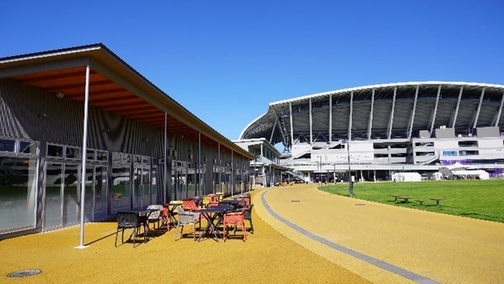 芝生ひろば:スタジアムと調和し、賑わいを演出するデザインの施設