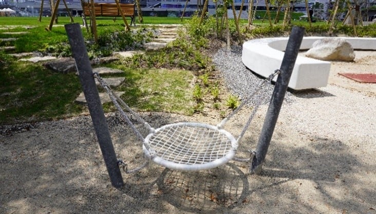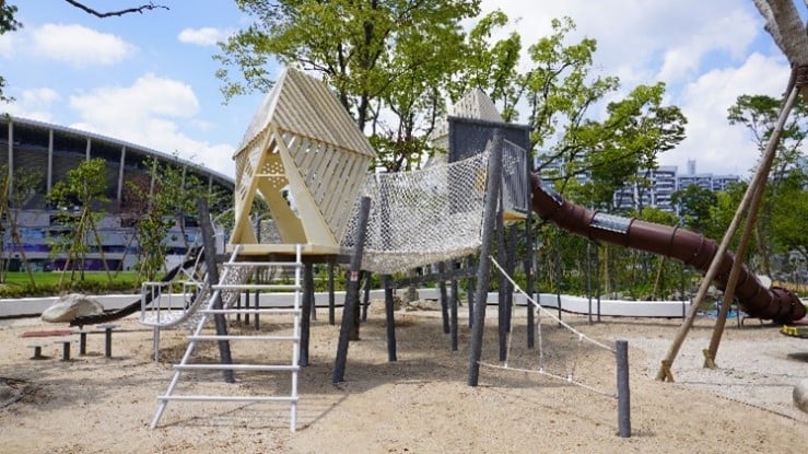 複合遊具「Mori no Sumika」は、中央公園の既存の森に馴染み、森に暮らす生きものたちが枝をつたって駆け回る様子をイメージした遊具です。“森の巣” を想起させるシンボリックな遊具を行き来する⼦どもたちは、高いところへ登る緊張感の中、⾃然と他の⼦どもとの協力や譲り合いを学び、勇気と達成感を感じながらいつもと違った風景を⽬にします。これら遊具での体験が、子どもたちの心身の成長を育みます。