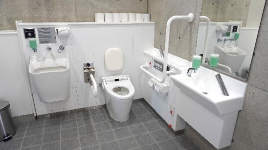 特定公園施設として芝生ひろば北側と水辺ひろばに1か所ずつ、公募対象公園施設として芝生ひろば南側の商業施設に1か所の計3か所の屋外トイレを整備しています。男女別トイレだけでなく、車いす利用者用トイレや⼦どもトイレ、おむつ交換スペース等をユニバーサルデザインに配慮して設計し、障がいを持つ方、高齢者、乳幼児連れのご家族など多くの方にとって訪れやすく快適に過ごせる公園をめざしました。なお、芝生ひろば南側のトイレには、授乳室も整備しています。