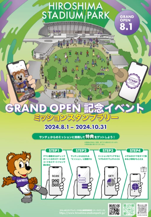 2024年8月1日(木)から10月31日(木)まで、チャットボット機能を活用してサンフレッチェ公式マスコット「サンチェ」と会話を楽しみながら行う、ストーリー体験型スタンプラリーを開催します。公園内に設置されたチェックポイントを巡りながら、ARを用いたミッションに挑戦しクリアをめざすイベントです。全ミッションをクリアした方には、HiroPa各店舗で使えるクーポンをプレゼントします。「ひろしまスタジアムパークフェスタ」の2日間はもちろん、終了後も魅力あふれるひろしまスタジアムパークとHiroPaを感じていただけるイベントです。詳細情報は公式ホームページをご参照ください。(https://www.hiroshima-stadiumpark.jp/news/event/post-072202/)